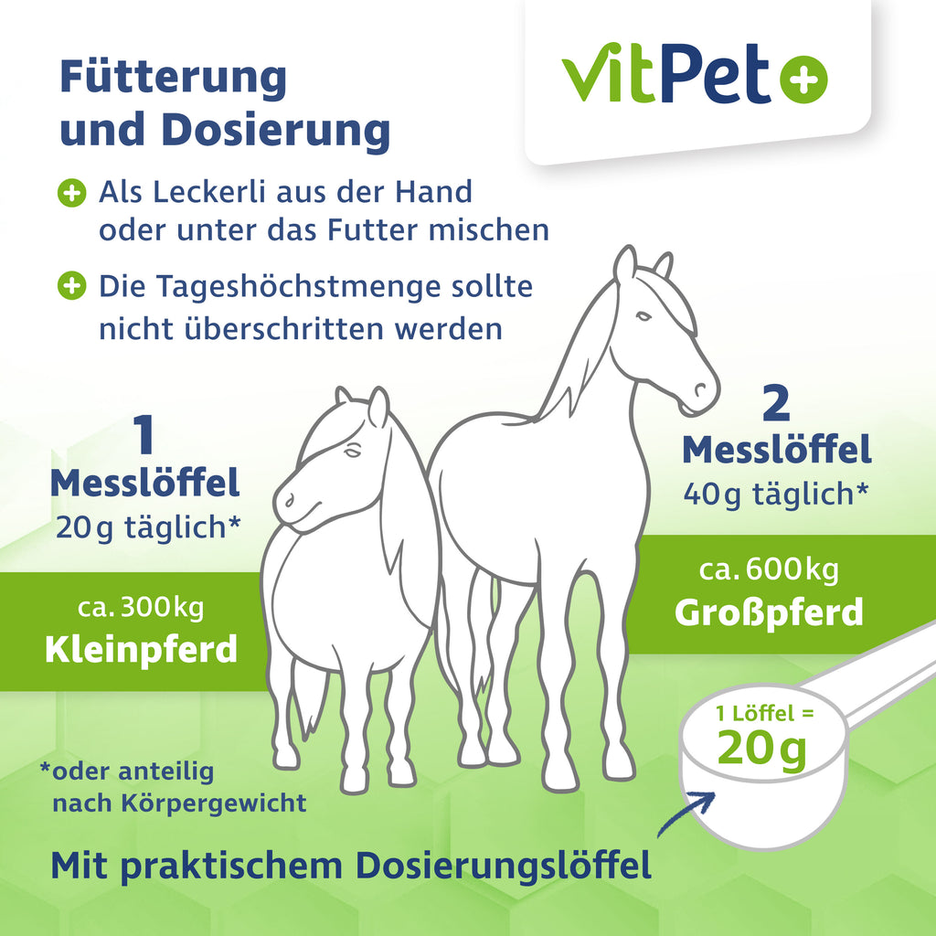 - BESONDERS ERGIEBIG UND LEICHT ZU DOSIEREN: Mit genauer Dosierempfehlung und praktischem 20 g Dosierlöffel in jedem VitPet+ Zink Forte Plus Produkt. In Abhängigkeit der Dosierung reicht ihnen ein Eimer bis zu 90 Tage.